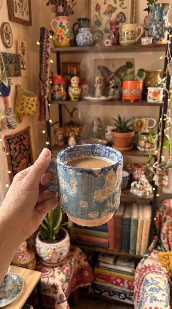 Taza Cerámica con esmaltes superpuestos en tonos marinos, que remiten a los colores de la ciudad costera de Essaouira-Marruecos