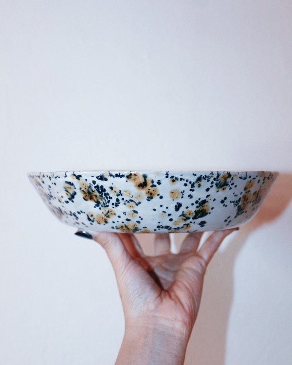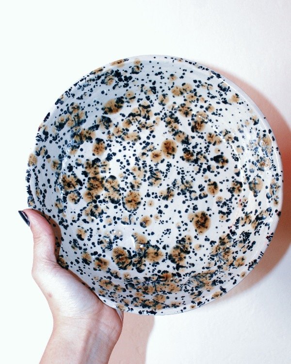 Bowl- ensaladera cerámica esmaltado en tonos grises y con pintas mocca y crema.